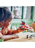The buildable starfighter includes a detailed cockpit, spring-loaded shooters, retractable landing gear, and storage compartments for accessories like a blue milk carton and banana. A perfect gift or collectible for LEGO and Star Wars fans alike.